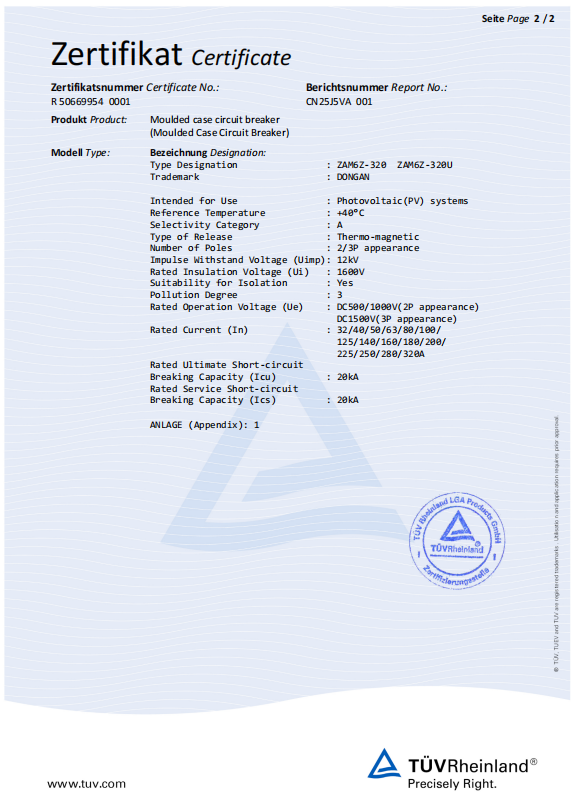 Breaking News: Greenwatts flagskib ZAM6Z 320A DC1000V/1500V Moluded Case Circuit Breaker har opnået TUV Rheinland-certificering (cert. No: R506699540001), hvilket styrker sin position som en top-tier DC MCCB-producent til vedvarende energisystemer!