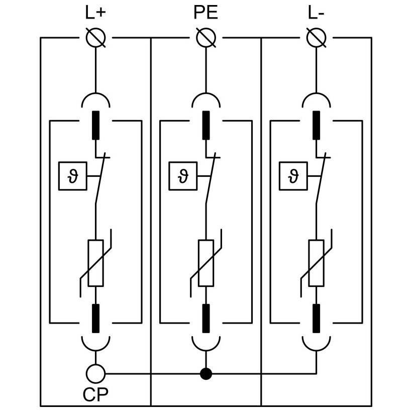Hver varistorsektor mellem L+, L– og PE er udstyret med en intern termisk afbrydelse. På varistorens ende-af-livet (overophedning), afbryder afbrydelsesture for at afbryde DC-strøm og give en klar fejlindikation. Den specielle afbrydelseskonstruktion muliggør installation uden en separat back-up sikring, forenkling af koordinering og spare plads.