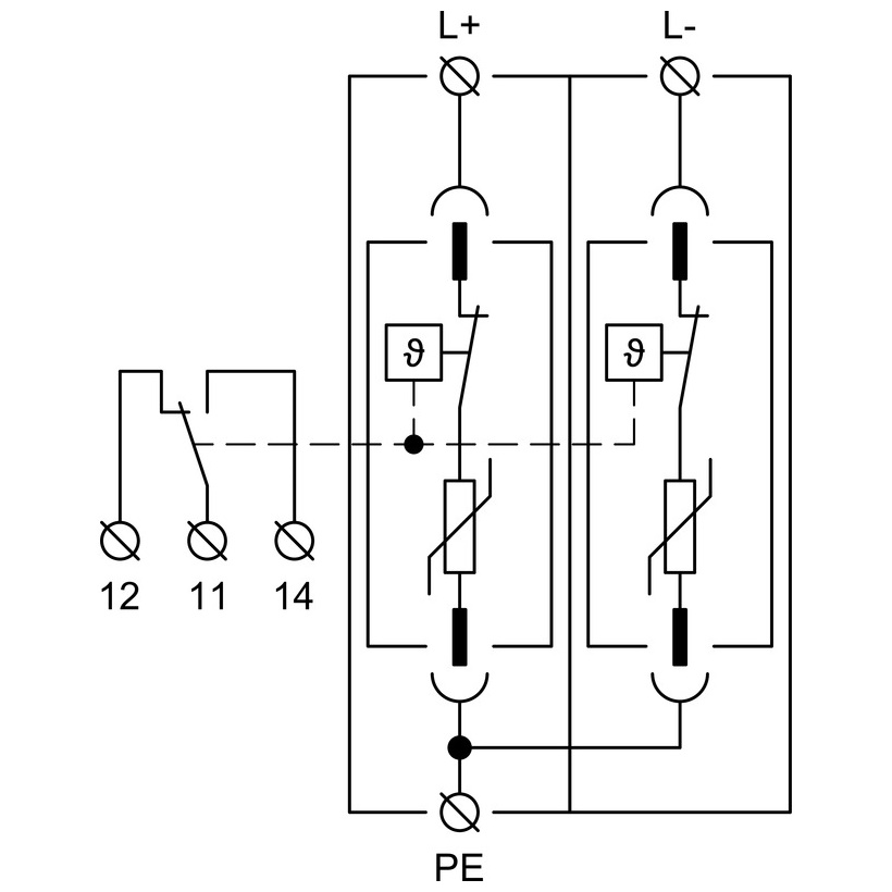 Særlige varistorsektorer mellem L+, L- og PE er hver udstyret med interne termiske afbrydere. Når en varistor når ud af slutningen af livet (overophedninger), angiver afbryderen, hvilket synligt indikerer en fejl og afbryder DC-strøm. Takket være deres specielle konstruktion kan disse arrestanter installeres uden en separat back-up sikring (underlagt systemkoordination).