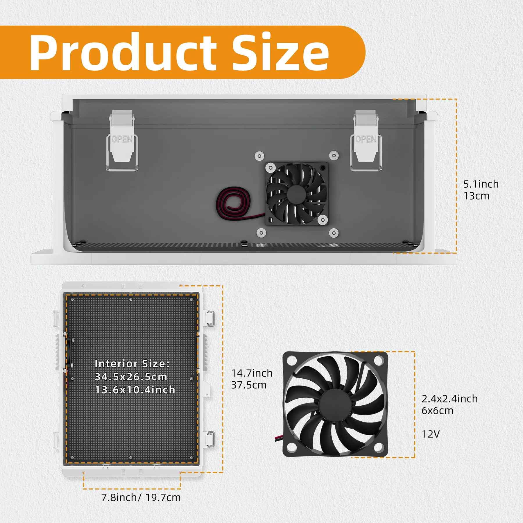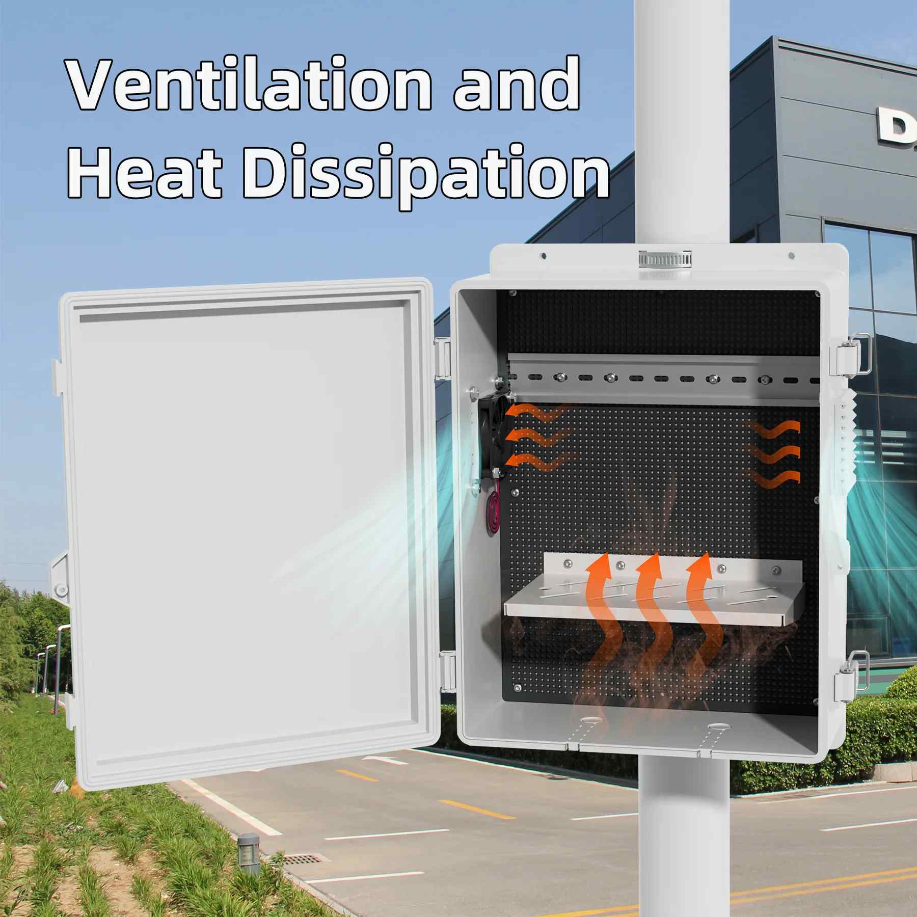 【Overlegen ventilation for optimal ydelse】- Denne elektriske kabinetfelt har en indbygget 12V-ventilator og udluftede sidepaneler til fremme af luftcirkulation og varmeafledning, som vist på billederne med det åbne indkapsling og luftstrømningspilene. Det integrerede ventilationssystem hjælper med at forhindre overophedning af følsomme elektroniske komponenter inde i boksen.