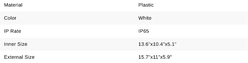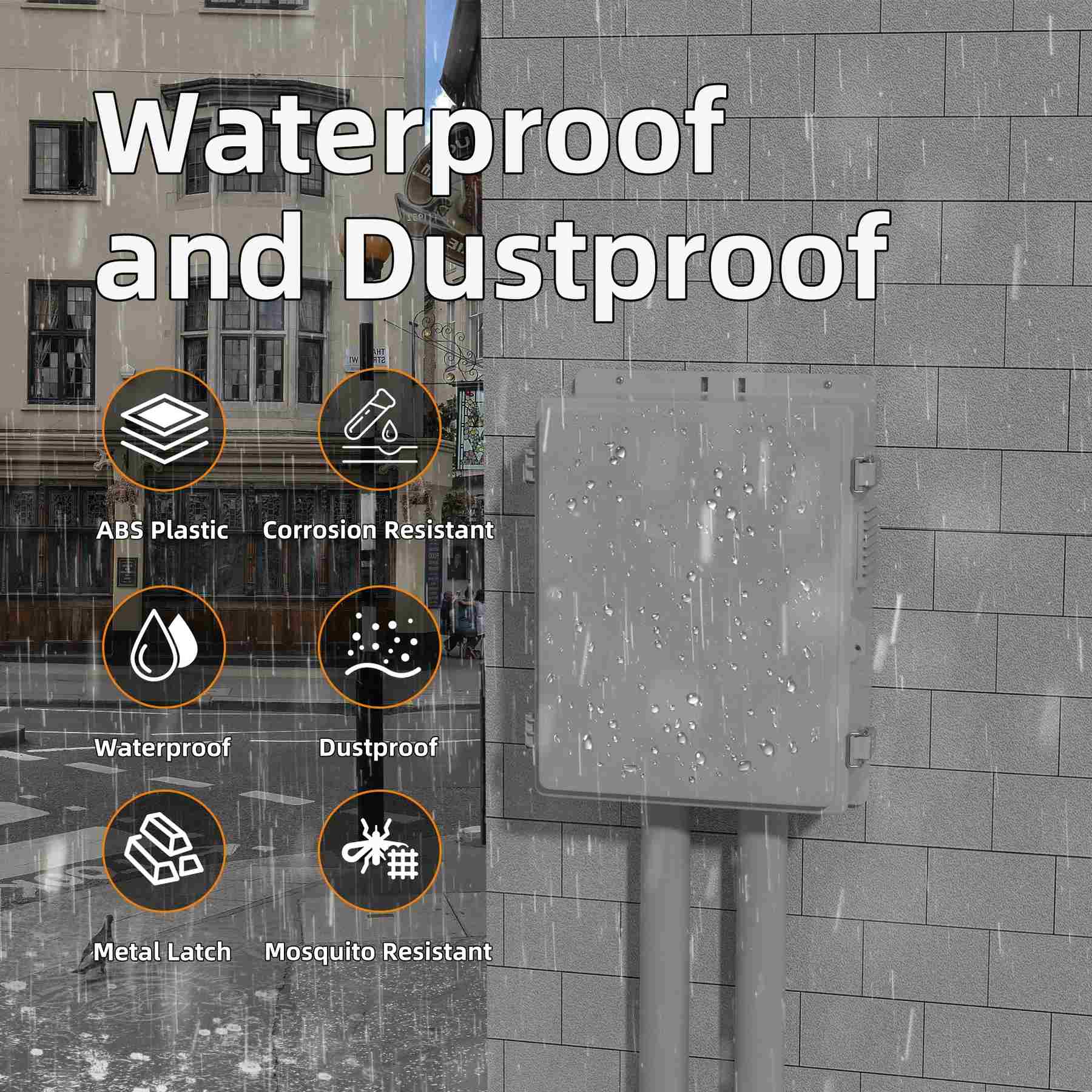 【Holdbar, vejrbestandig og sikker konstruktion】- kassen er udformet af kraftig ABS-plast, hvilket gør det til korrosionsbestandigt og resistent over for UV-skader, som indikeret af ikonerne, der viser, at det er vandtæt, korrosionsbestandigt, mygbestandigt og har en metallås til yderligere tætning. Indkapslingen er også IP65 vandtæt og støvtæt og har sikre metallås.